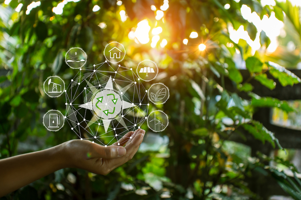 Technology, hand holding with environment Icons over the Network connection on green background.